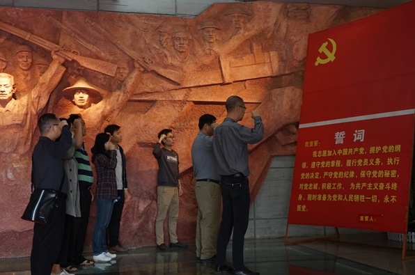 上午10点,在纪念馆内,党员们重新举行了入党宣誓仪式。党员同志面对鲜红的党旗,庄严肃穆地举起右手,在支部书记邝清同志的带领下,重温了入党誓词,铮铮誓言的呐喊声响彻整个纪念馆。